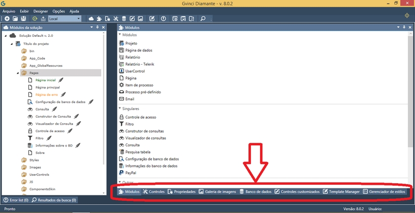 Os painéis disponibilizam opções para inserir um módulo, exibir as propriedades, inserir controles, configurar os bancos de dados e inserir imagens, além de gerenciar Templates na solução. Os painéis ficam localizados à direita do design e podem ser acessados pelo mouse, pelo menu "Exibir" ou pelas teclas de atalho.