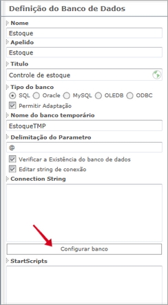 Ao desmarcar a opção "Editar string de conexão" no painel Banco de dados, o campo usado para edição "Connection String" é desativado e ao mesmo tempo, o botão "Configurar banco" é habilitado. Isso faz com que o caminho para o banco de dados seja armazenado no arquivo Web.config e não será mais necessário que o usuário indique a localização do banco.