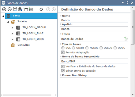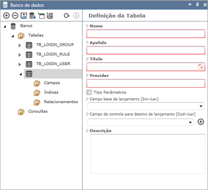 Nome: Insira o nome para a nova tabela. Este nome será usado internamente pela aplicação. É a primeira propriedade a ser preenchida após inserir a nova tabela.