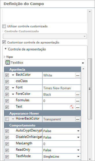 Na definição do campo você pode definir também as propriedades de apresentação do controle. Cores, configurações de fonte, tamanho do controle, além das propriedades relacionadas com o comportamento do controle podem ser definidas.