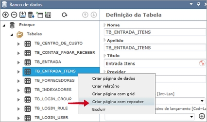 Após ter definido a tabela, você pode utilizar um atalho para criar uma página com o controle Repeater, usando os campos da tabela como conteúdo. O menu de atalho é exibido ao clicar na tabela com o botão direito. Para detalhes, consulte o tópico Repeater.