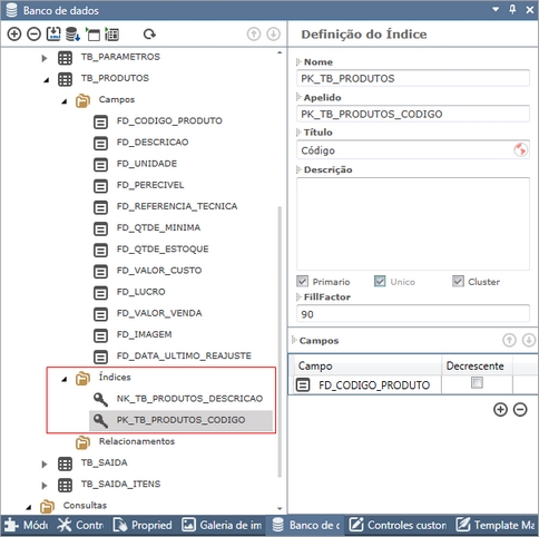Índices da tabela TB_PRODUTOS do exemplo Controle de Estoque.