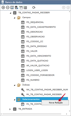 Para criar um novo relacionamento, utilize o botão direito do mouse sobre "Relacionamentos" e clique em "Nova Relação", ou então utilize o botão .