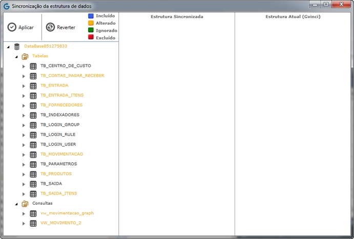 Na seção Estrutura Sincronizada é exibida a estrutura original do banco, conforme gravada no servidor SQL. Na seção Estrutura Atual é exibida a estrutura do banco cuja solução está aberta no Gvinci.