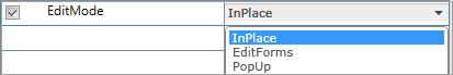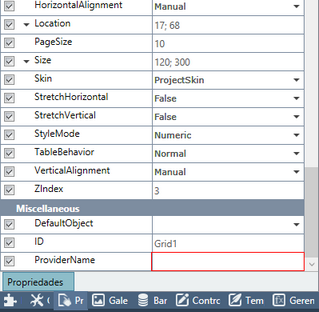 • AllowRowResize: Permite redimensionar a altura das linhas do grid • AllowScroll: Ativa e desativa a rolagem no Grid na aplicação gerada • AllowSelectionCheckBoxes: Permite o uso de caixas de seleção no Grid • AllowSorting: Habilita a classificação de dados do Grid • AllowUpdate: Ativa e desativa a exibição do botão "Editar". Este botão é utilizado para fazer a alteração dos itens do Grid.