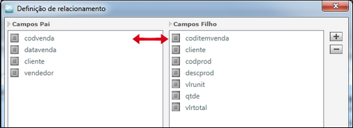 A janela de definição de relacionamento aparecerá. Observe a exibição dos campos das duas tabelas envolvidas: a tabela básica da página de dados do lado esquerdo e a tabela que vai fornecer os dados para o Grid do lado direito da janela.