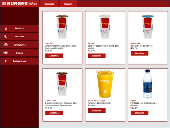 A tela abaixo pode ser visualizada em http://samples.gvinci.com.br/BurgerSite/Pages/Home.aspx , na opção "Cardápio".