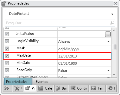 • Comportamento • DatePickerType: Permite escolher o tipo do controle entre: • Date: Mostra somente a data • DateTime: Mostra a data e o horário • Time: Mosra somente o horário • DatePopupButton-Visible: Mostra o botão para abrir o calendário para escolha da data e horário. • MaxDate: Permite definir uma data limite para exibição no calendário. O formato da data nesta propriedade deverá ser : MM/dd/yyyy