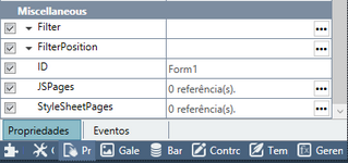 Além das propriedades comuns dos controles, destacamos as específicas deste controle: • Aparência • DefaultButton: Permite definir um botão padrão para a página. Isso pode ser necessário quando a página possuir vários botões e desejarmos que um deles receba o foco quando a página for carregada na execução da aplicação • EnableEventValidation: Habilita a validação de evento • Comportamento • DeleteValidation: Permite definir uma condição para deletar o registro apresentado na página • InsertValidation: Permite definir uma condição para inserir registros na página • UpdateValidation: Permite definir uma condição para alterar o registro apresentado na página • JavaScripts • BodyRegion: que tratem do corpo da página, entre o cabeçalho e o rodapé • EndScripts: de fechamento da página ou formulário • HeaderRegion: do cabeçalho da página • RegisterScript: na área de registro da página • StartScripts: de início da página • Layout • SetFocusFirstField: Posiciona o cursor no primeiro campo do Form quando o Form for aberto na execução da aplicação • Miscellaneous • FilterPosition: Define a posição do filtro na página • JSPages: Permite inserir referências a páginas JavaScript através da janela exibida abaixo: