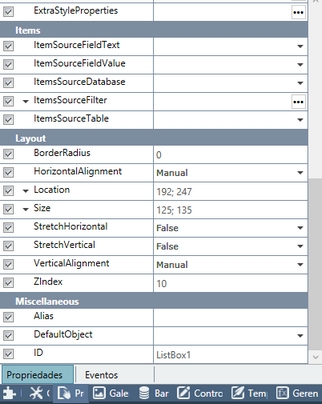 • Comportamento • SelectionMode / Modo de Seleção: Altera o modo de seleção dos itens da lista, sendo único (Single) ou múltiplo (Multiple) • Items • ItemSourceFieldText / Campo do Item: Define o campo que será mostrado • ItemSourceFieldValue / Valor do Item: Define o campo que será capturado • ItemsSourceDatabase / Bando de Dados do Item: Permite inserir um nome de banco de dados para os itens da lista • ItemsSourceFilter / Filtro do Item: Abre a janela Filtro permitindo inserir um filtro para os itens, através do botão extensor • ItemsSourceTable / Tabela do Item: Determina a tabela que fornecerá os dados para os itens