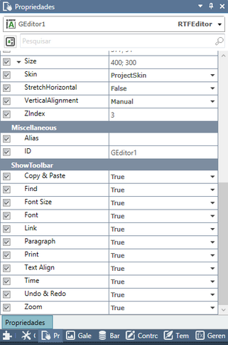 • ShowToolbar • Copy & Paste: Habilita o uso do Clipboard para copiar e colar textos • Find: Habilita a procura de textos dentro do Editor • Font Size: Permite alterar o tamanho da fonte do texto • Font: Altera o tipo da fonte utilizada • Link: Permite inserir um link no texto • Paragraph: Ativa o uso de parágrafos • Print: Habilita a impressão do texto • Text Align: Permite alinhar o texto • Undo & Redo: Habilita as tarefas de desfazer e refazer durante a edição do texto • Zoom: Permite alterar o nível de visualização no texto (zoom)