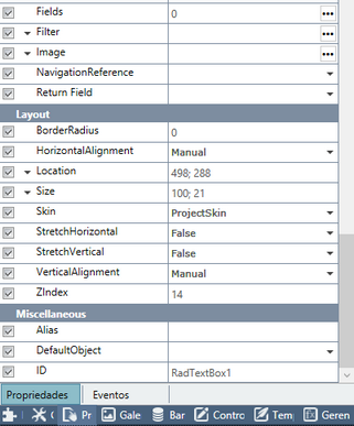 • Comportamento • MaxLength: Quantidade máxima de caracteres que o usuário poderá inserir na caixa de texto. Quando o campo vinculado ao TextBox for do tipo Memo, o valor desta propriedade será "0", aceitando grande quantidade de caracteres • ReadOnly: Ativa e desativa o modo somente leitura do controle • ShowButton: Mostra botão para ação dentro do controle • TextMode: Possui as seguintes opções: • Multiline: quando aceitará mais de uma linha • Singleline: quando terá uma só linha • Password: com caracteres disfarçados para senha • Dados • EmptyValue: Permite selecionar NULL para quando o controle receber dados inválidos ou VAZIO para quando o controle ficar com o número zero ( 0 ) • Extensor • DataDB: Seleciona o Banco de dados • DataTable: Seleciona a Tabela • Fields: Escolhe os Campos • Filter: Define um filtro para os registros • Image: define uma imagem para o fundo do campo • NavigationReference: veja em propriedades comuns dos controles • Return Field / Campo Retornado: Define o campo onde a pesquisa será feita e cujo conteúdo será retornado pela pesquisa