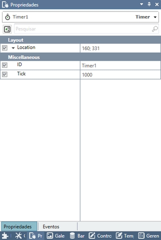 Além das propriedades comuns dos controles, destacamos as específicas deste controle: • Miscellaneous • Tick / Intervalo: Determina o intervalo, em milissegundos. Após o término deste intervalo, a ação inserida no evento ClientTimeElapsed será executada