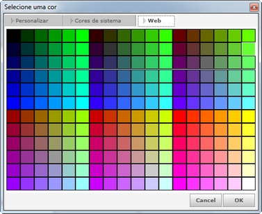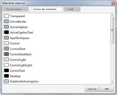 Ao alterar as cores do fundo (BackColor) ou então as cores do texto (ForeColor) de um controle, bem como as cores de seus componentes, como a borda do controle, a caixa de cores abaixo é exibida, apresentando as seguintes opções: