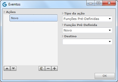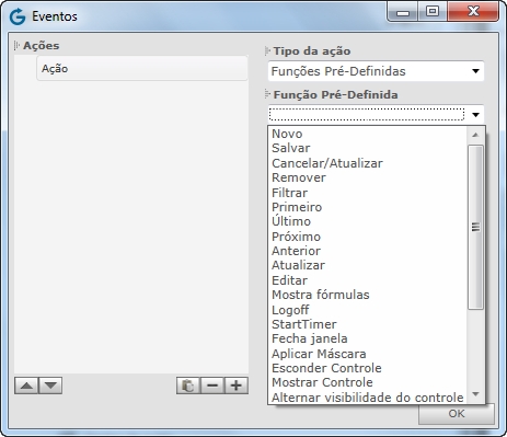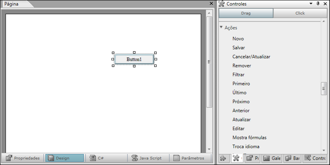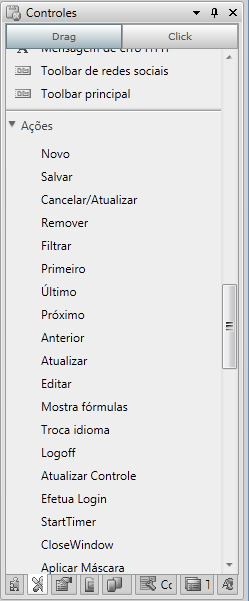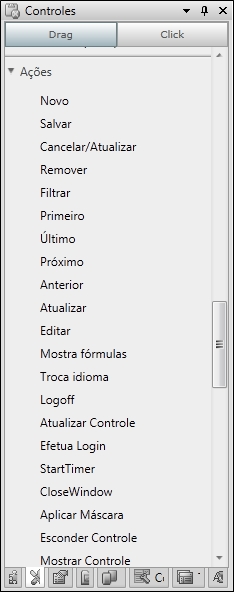 As ações disponíveis no painel Controles podem ser aplicadas a controles que forem inseridos no design, de acordo com o módulo selecionado. Essas ações já estão com as funções definidas, de acordo com seu nome.