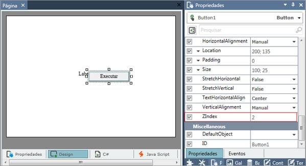 No design representado abaixo, um exemplo do uso da propriedade Z-Index, o controle Button está sobreposto aoLabel.