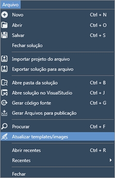 Para atualizar o banco de imagens de sistema, feche a solução atual e utilize a opção "Atualizar templates/images" no menu Arquivo: