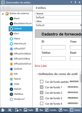 O painel Gerenciador de Estilos permite visualizar as combinações de cores aplicadas nos controles gerais para acompanhar os templates da Telerik®.
