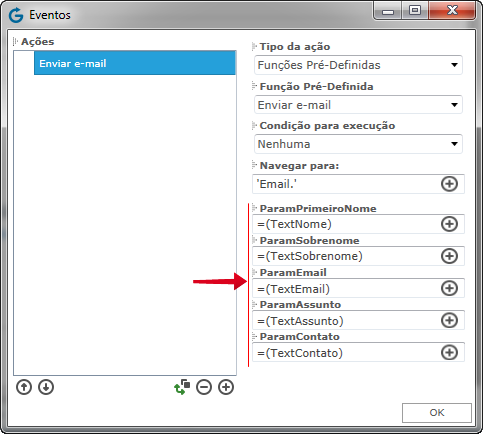 Esses parâmetros serão utilizados na definição da ação Navegação, no evento do clique do botão que irá executar o envio de email.
