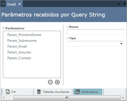 As definições dos campos do módulo Email podem ser feitas com a inserção de parâmetros que são criados na própria página através do botão