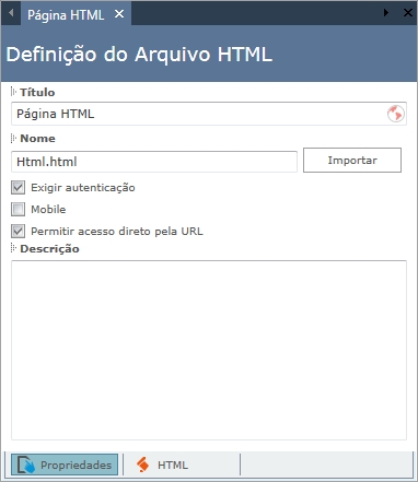 Nome: Insira o nome do arquivo HTML. Este arquivo será armazenado na pasta do módulo em que for inserido, após a geração do código fonte.