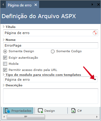 6. Na opção "Tipo de módulo para vínculo com templates", clique na lista e selecione Página de erro;