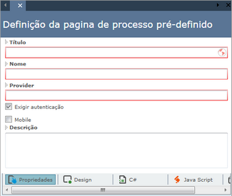 Ao clicar duas vezes sobre o Processo no painel Módulos da solução, as propriedades do item são exibidas. Observe a seguir as definições de cada propriedade a ser preenchida: