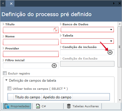 Para inserir condições de inclusão de registros em tabelas, utilize a opção "Condição de inclusão", na definição do processo pré-definido. Dê um duplo-clique no Item de processo e a tela de definição será exibida: