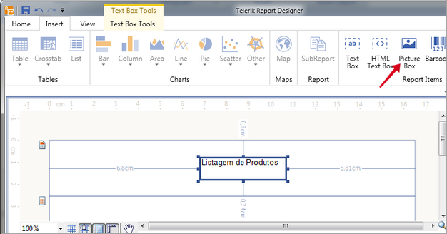 7. Selecione a área Header do relatório e, com a aba Insert aberta, clique no controle TextBox;