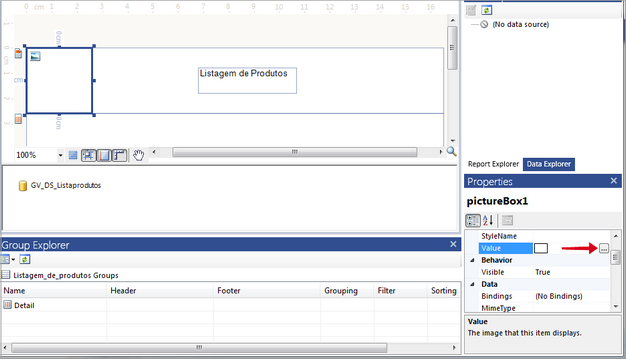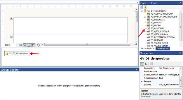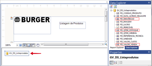 6. Clique na fonte de dados GV_DS_Listaprodutos para que sejam exibidos os campos da tabela na janela Data Explorer;