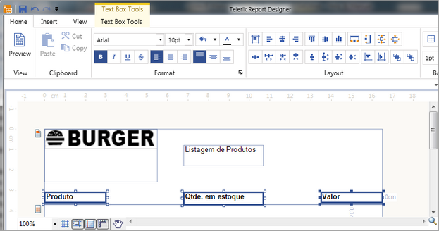 Por isso, vamos inserir somente 03 TextBox que serão usados como títulos das colunas no relatório.