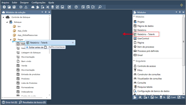 2. Após criada a solução, abra o menu Módulos e arraste o módulo Relatório Telerik para a pasta Pages;