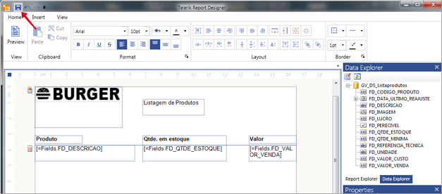14. Selecione a fonte de dados para visualizarmos os campos na seção Data Explorer. Neste relatório, vamo utilizar somente 03 campos: FD_DESCRIÇÃO, FD_QTDE_ESTOQUE e FD_VALOR_VENDA, em destaque na figura abaixo: