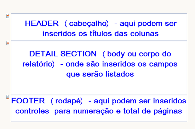 A área HEADER (cabeçalho) pode ser usada para inserir os controles TextBox que serão usados como títulos de colunas e também pode ser usada para títulos do relatório, além de figuras usadas como logotipo de empresas.