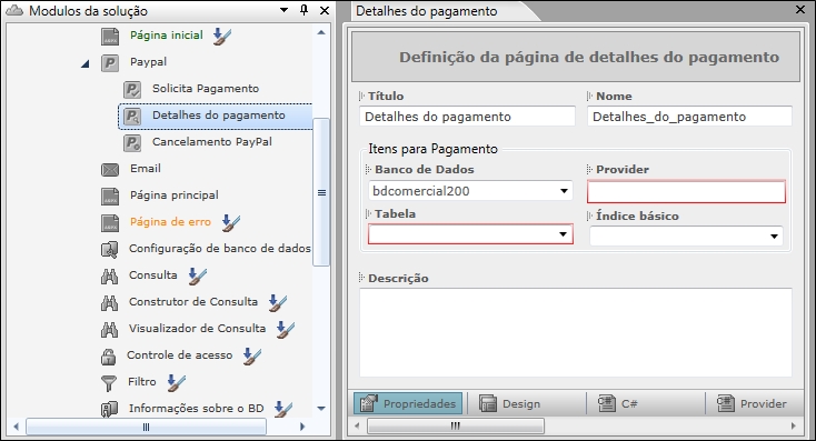 Itens para Pagamento:•Banco de dados: Insira o banco de dados da tabela do módulo•Tabela: Insira a tabela básica para o módulo•Provider: Insira o provider do módulo •Índice básico: Defina qual o índice da tabela básica do módulo