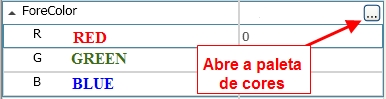 ForeColor / Cor da Fonte: Altera a cor do texto do controle, utilizando o esquema RGB, além de outras opções disponíveis na paleta de cores: