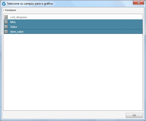 • CheckBox: Nesta lista aparecerão os campos da tabela básica da página de dados onde está o controle. Você poderá então selecionar um campo para armazenar o valor do CheckBox: • Valor = 1 : Quando o controle estiver marcado. • Valor = 2 : Quando o controle estiver desmarcado. • Graph: Nesta propriedade você pode selecionar os campos que serão exibidos no gráfico. Após clicar no botão , clique nos campos que desejar: