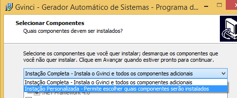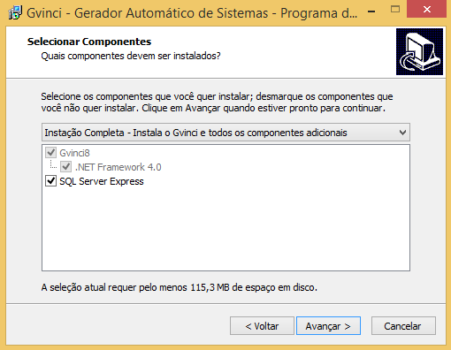 11. Escolheremos a "Completa", mas observem que as opções "Gvinci" e ".NET Framework" serão sempre instaladas, podendo desmarcar apenas a opção "SQL Server Express"