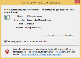 6. Após o download, localize o arquivo instalador e execute-o, através de um duplo clique. Um aviso de segurança será exibido.