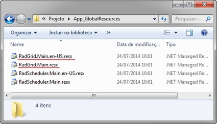 •RadGrid.Main.en-US.resx: Usado quando a aplicação está em inglês •RadGrid.Main.resx: Utlizado quando a aplicação está em português ou outra linguagem diferente de inglês.