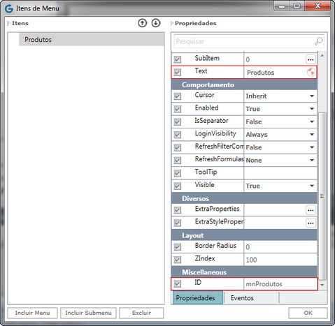 5. Na propriedade ID, coloque o nome do item de menu. Este nome será utilizado internamente pela aplicação.