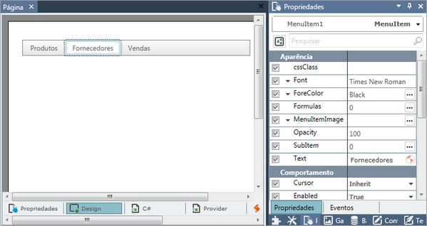 Após ter inserido a barra de menus com seus itens, você poderá selecionar cada item facilmente: basta clicar sobre o item e alterar as propriedades conforme desejado: