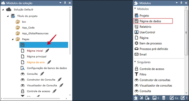 2. Clique sobre o módulo Página de Dados e arraste-o para a árvore, dentro do módulo Pages.