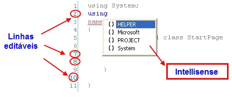 Ao editar os códigos, é importante enfatizar que as palavras reservadas devem iniciar com letras minúsculas, enquanto que as palavras usadas para namespace, controles, métodos, iniciam com letra maiúscula.