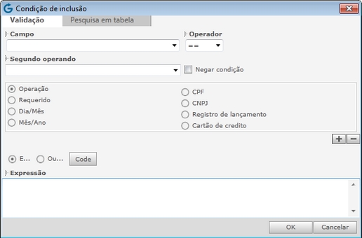 6. Para executar o lançamento: Preencha o campo Condição de inclusão de lançamento, clicando sobre o botão ,utilizando os mesmos recursos existentes para a criação das validações e pré-validações explicadas anteriormente neste tópico. Assim, o lançamento só será criado quando esta condição for atendida;
