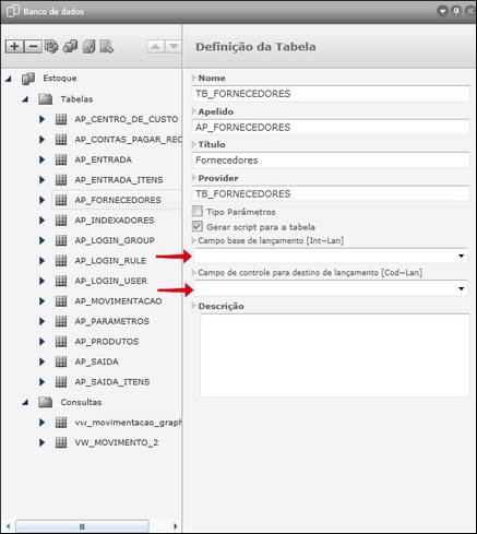 Sempre que um lançamento é definido no projeto, dois campos podem ser designados para controle dos lançamentos, na definição da estrutura da tabela: