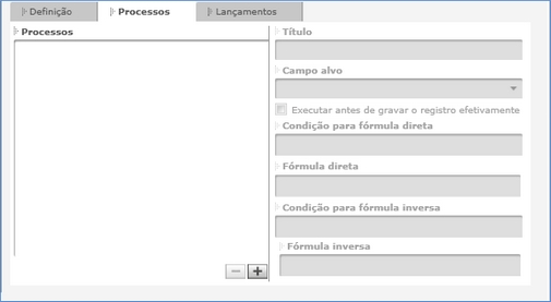 A definição de processos é semelhante à definição de lançamentos, explicada no item anterior. A principal diferença é que, no lançamento, um registro novo é criado na tabela alvo e seus campos são modificados. Já no processamento, um registro deve ser localizado e posicionado na tabela alvo para que um ou mais campos sejam modificados.